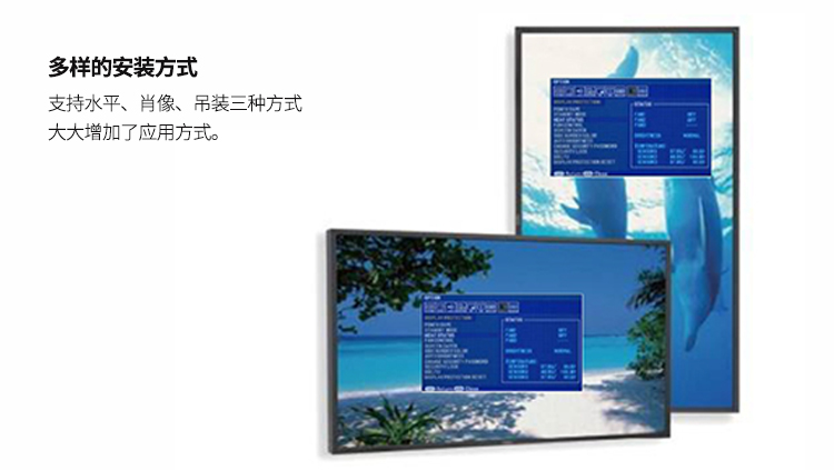 水平、肖像、吊裝三種安裝方式大大增加了應用方式及顯示效果